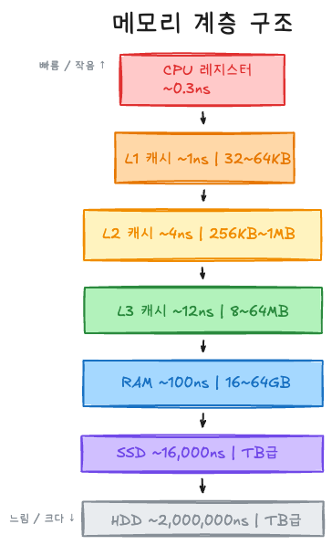 이 물리적 제약 때문에, 현대 컴퓨터는 메모리를 계층적으로 구성한다. 자주 쓰는 데이터는 가까이, 가끔 쓰는 데이터는 멀리 둔다.