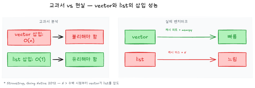 자료구조 교과서의 첫 장은 보통 추상적 인터페이스(ADT)에서 시작한다. “리스트는 삽입, 삭제, 접근을 지원하는 추상 자료형이다.” 이 추상화는 개념을 배울 때는 유용하지만, 실제 코드를 작성할 때는 구현의 물리적 특성을 무시할 수 없다.