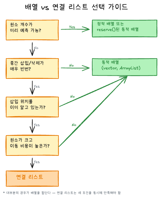 대부분의 경로가 배열로 향한다. 연결 리스트로 가려면 세 가지 조건을 동시에 만족해야 한다: 빈번한 중간 삽입, 위치를 이미 알고 있음, 원소 이동 비용이 높음. 이 조건이 동시에 성립하는 경우는 생각보다 드물다.